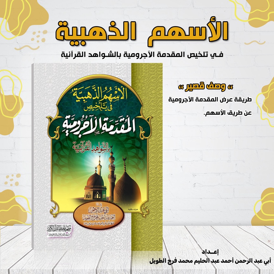 ويأتي كتابي «الأسهم الذهبية في تلخيص المقدمة الآجرومية بالشواهد القرآنية» ليقدِّم شرحًا معاصرًا لهذا المتن المبارك، بأسلوب بصريٍّ تعليميٍّ يجمع بين الأصالة والمنهجية الحديثة، ويقوم على تقسيم كل درس إلى صفحتين متقابلتين، تحتويان على المتن وشرحه معًا؛ ليبقى النص حاضرًا في ذهن الطالب أثناء التعلم دون الحاجة إلى الرجوع لمصدر خارجي.